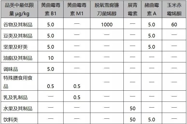 由于真菌毒素的危害極大,國家對食品中的真菌毒素也有著嚴格的限量標準。在《GB2761-2017 食品安全國家標準食品中真菌毒素限量》標準中,國家對最常見危害最大的6種真菌毒素在不同食品中的限量做出了規定。針對每個品類中產品最低限量值匯總如下: