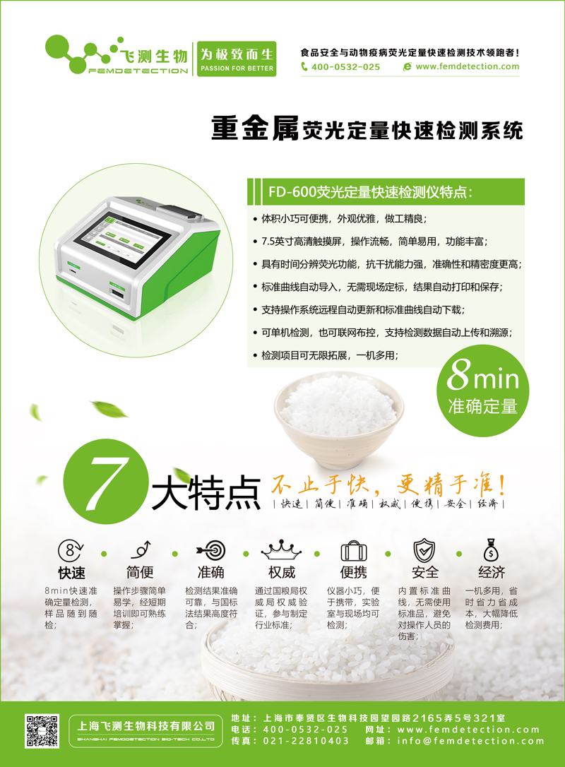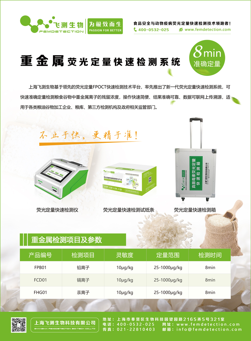 以上幾種方法所需儀器較復雜貴重,前處理準備時間及檢測時間較長。上海飛測生物基于領先的熒光定量FPOCT技術平臺,開發了真菌毒素+重金屬+農藥殘留三合一熒光定量快速檢測系統,該系統結合了膠體金快速、酶聯免疫定量以及色譜法準確的特點,可在8min內快速準確定量的測定出食品中重金屬的含量。前處理時間40分鐘左右,檢測范圍25ppb-1000ppb,可以滿足限量標準檢測;操作簡便,只需一步加樣,無需標準品,無需做標準曲線,采用熒光免疫定量分析儀讀數,結果準確可靠且可現場打印,準確性高度符合HPLC法的檢測結果,為重金屬快速檢測提供了一種全新的技術手段,適用于各類飼料加工企業、第三方檢測機構及政府相關監管部門。