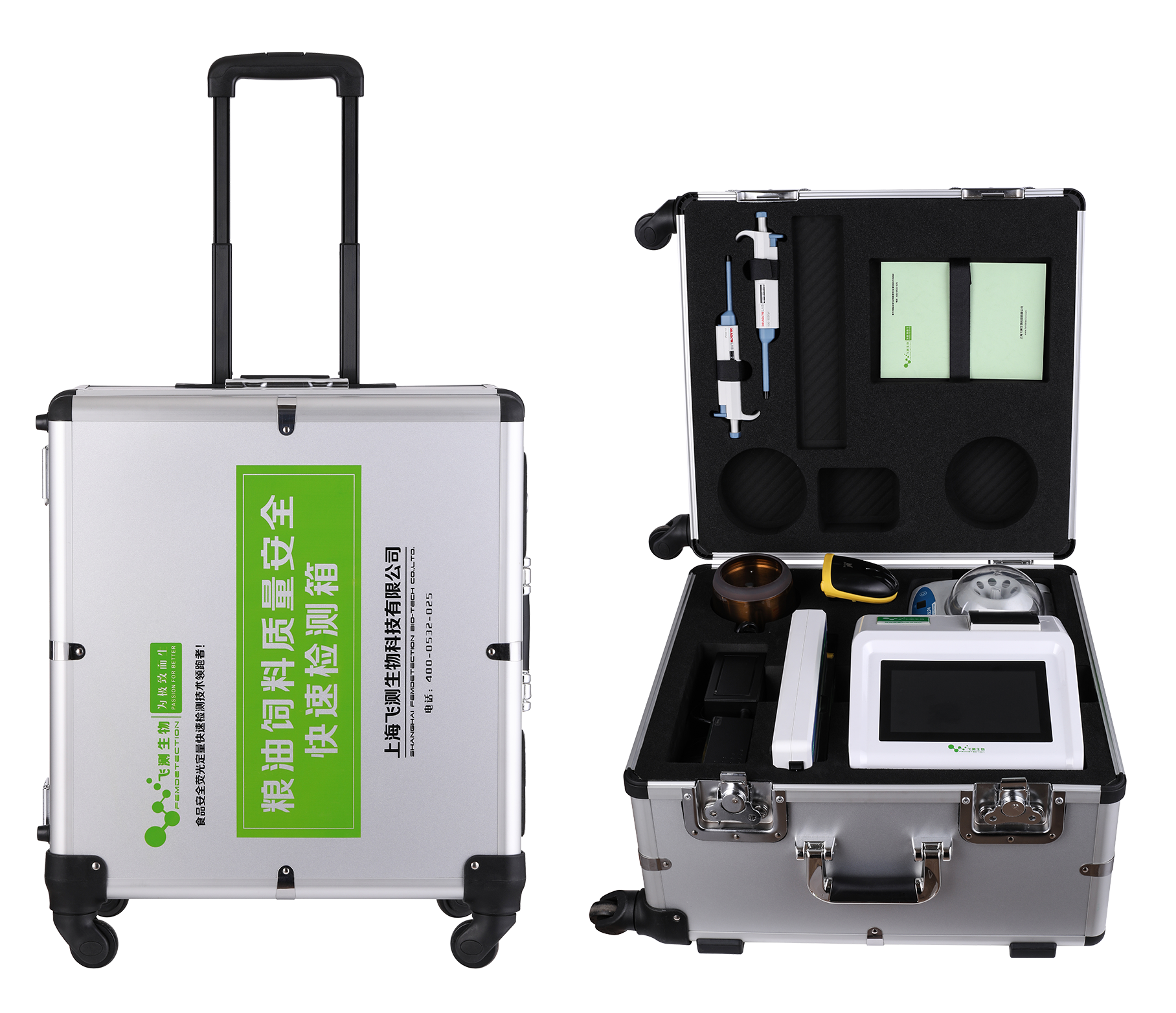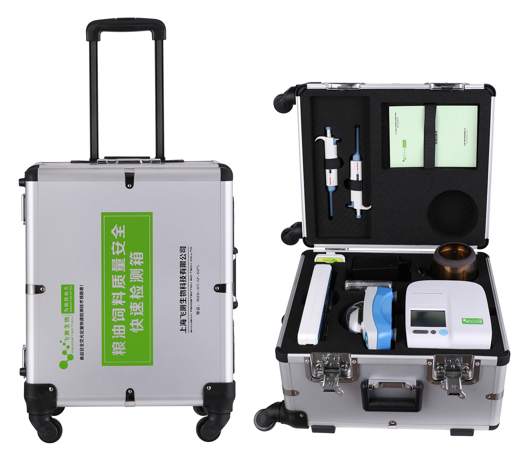 主要功能和特點:為方便外出檢測和現場檢測,快檢箱中配置齊全樣品前處理和檢測所需的設備和耗材,箱體配有帶滾輪和拉桿,方便攜帶,外觀精美,牢固耐用,檢測項目不僅包括黃曲霉毒素、玉米赤霉烯酮、嘔吐毒素、赭曲霉毒素A、伏馬菌素、T2毒素等真菌毒素,還可檢測重金屬、農藥殘留、轉基因等項目。檢測結果可現場打印,也可通過GPRS實時傳送到溯源管理云平臺,實現檢測結果的自動分析、全過程質量控制、檢測數據共享、溯源管理、大數據分析等功能,為糧油質量安全的快速現場檢測提供了一種全新的技術手段,真正的糧油飼料質量安全移動快速檢測實驗室。